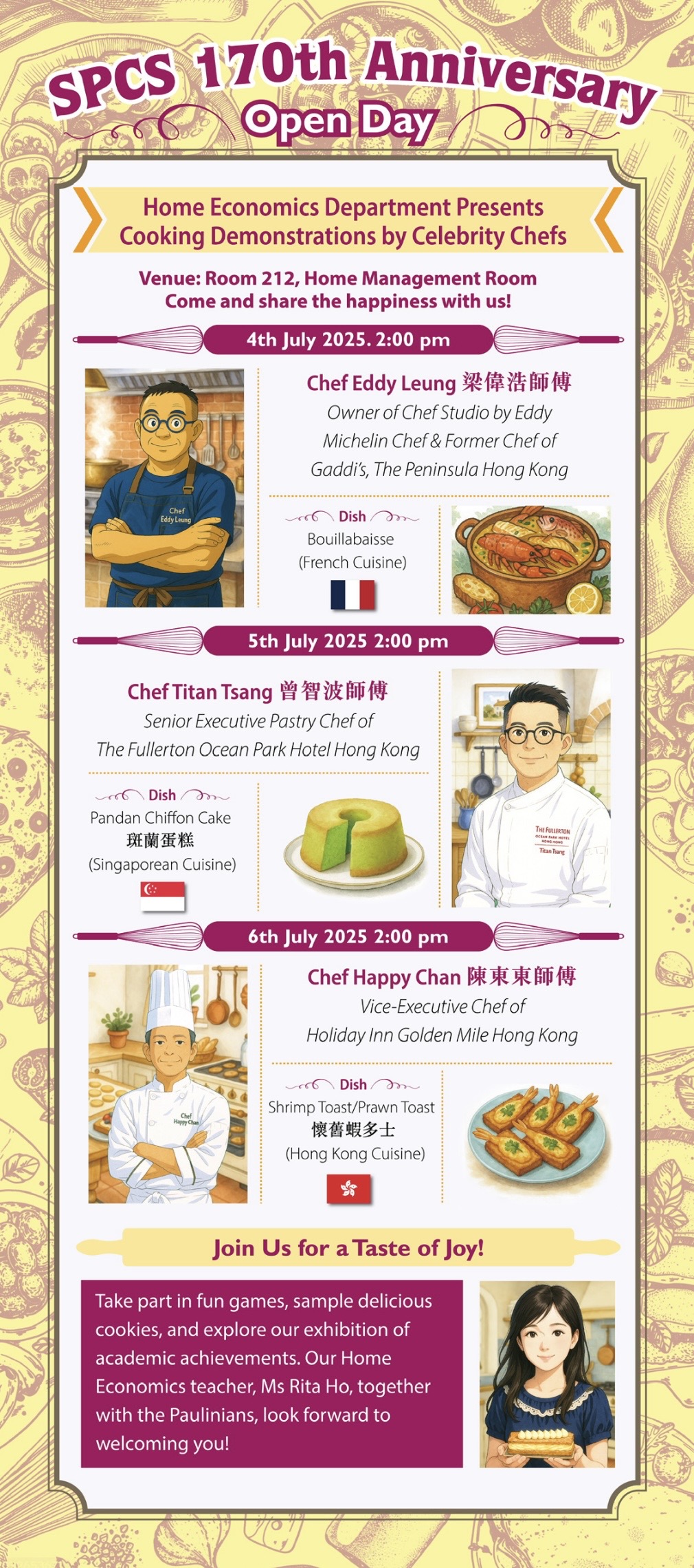 Organising these exceptional demonstrations required considerable effort and coordination. We extend our deepest appreciation to all our distinguished guests, parents, students, and friends for your continued support throughout these celebrations.For those interested, Ms. Rita Ho, Head of the Home Economics Department, has compiled an elegant recipe booklet featuring the dishes demonstrated during these cooking shows. Please contact Ms. Ho directly if you would like to receive a copy.