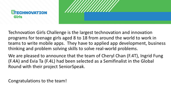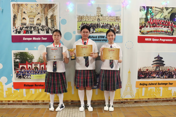 Our school's team, consisting of Tianna Liu (F.5S), Hayley Mok (F.5S), Alina Tam (F.5L), and Jasmine Sin (F.4L), proposed "Smart Crowd Management"¡Xa drone equipped with a convolutional neural network (CNN) deep learning system aimed at controlling crowd flow during large events. In the end, our team won the championship!