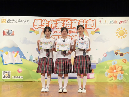 我校中四施謝心翹同學、中三保何梓童同學及中四雅劉凱欣同學早前參加了由香港中華文化發展聯合會(文聯會)主辦的「2024/25 學年 學生作家徵文比賽」,分別榮獲高中組三等獎、初中組優異獎及高中組優異獎。比賽主題圍繞中華傳統美德及品行,旨在激發中學生對寫作與閱讀的興趣,以增強創作及中文應用能力,達至多元學習。